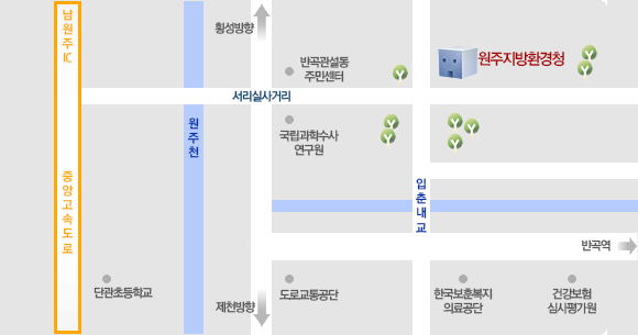 메인 컨텐츠 화면 기관소개 찾아오시는길 약도 및 교통편 기관소개 청장소개 인사말 프로필 현장스케치 역대청장 일반현황 임무 및 연혁 관할구역 실적 및 계획 조직 및 업무 조직도 부서업무 업무안내 찾아오시는길 기관소개 청장소개 인사말 프로필 현장스케치 역대청장 일반현황 임무 및 연혁 관할구역 실적 및 계획 조직 및 업무 조직도 부서업무 업무안내 찾아오시는길 약도 및 교통편 약도 및 교통편 청사안내도 자가용이용시 * 남원주IC(원주방향) → 시청사거리 우회전 → 직진(약 4km) → 단관교차로(11시 방향) → 직진(약 2km) → 국립과학수사연구원 방향 우회전 → 약 650m 좌측지점 대중교통이용시 * 시내버스 [52](국립과학수사연구원 앞 하차 후 도보 5분), [84](한국보훈복지의료공단 앞 하차 후 도보 5분) 주소 및 연락처 우)26461 강원특별자치도 원주시 입춘로 65(반곡동 960) / Tel) 033-764-0981 스크립트 기능이 지원되지 않거나 기능이 제한된 브라우저입니다. 이 페이지에서 제공하는 정보에 만족하셨습니까? 매우만족 만족 보통 불만족 매우불만족 확인